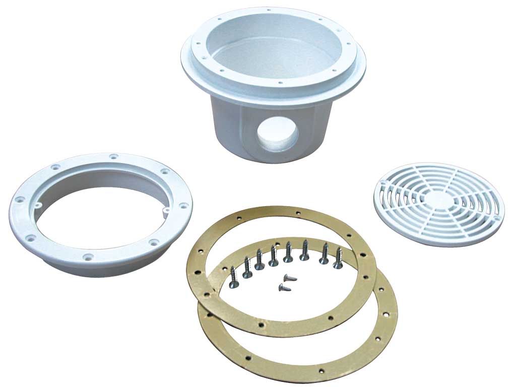 Beyaz ABS plastikten mamul. Alttan hidrostatik vana bağlantısı için Ø 50 mm içten yapıştırmalı, hazır kör ağız. Flanş, paslanmaz çelik vida ve contaları ile komple. Yandan çıkışlı.